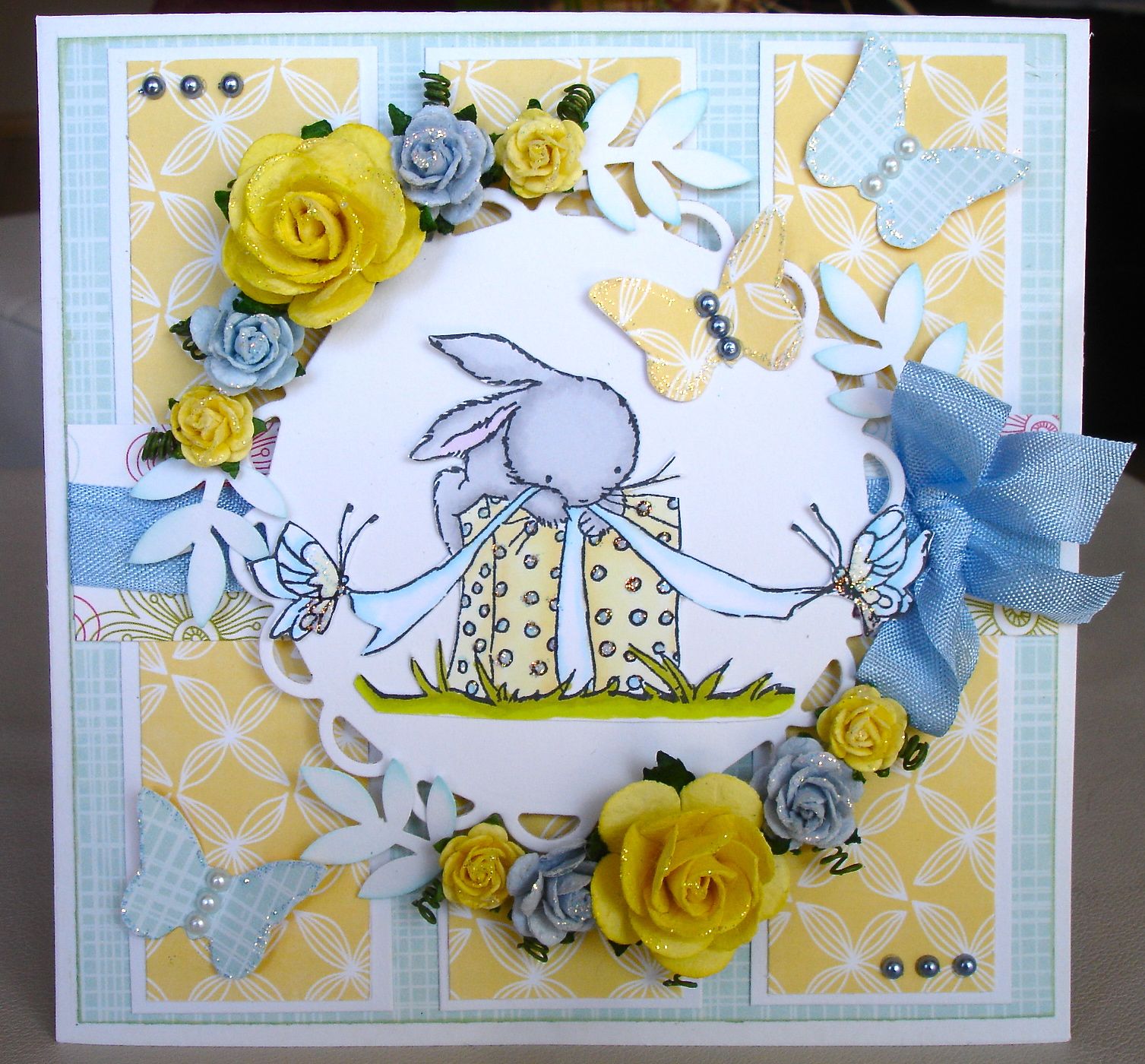 The image is called Gift Wrapped and I have coloured it with ProMarkers.The papers are from Echo Park-Springtime , flowers,pearls and ribbon are all from WOC.I have added some Stickles to the dots on the gift,on the butterflies and also on the flowers.